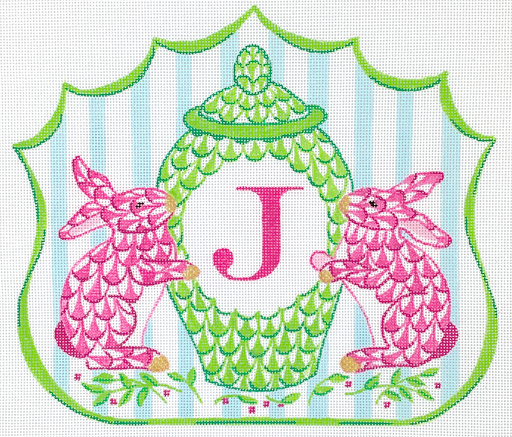 Monogram Crest – Fishnet Bunnies & Porcelain Pot – pinks, greens & soft blue