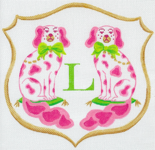 View full detailsMonogram Crest – Staffordshire Long-tail Dogs w/ Bows – pinks, greens & gold