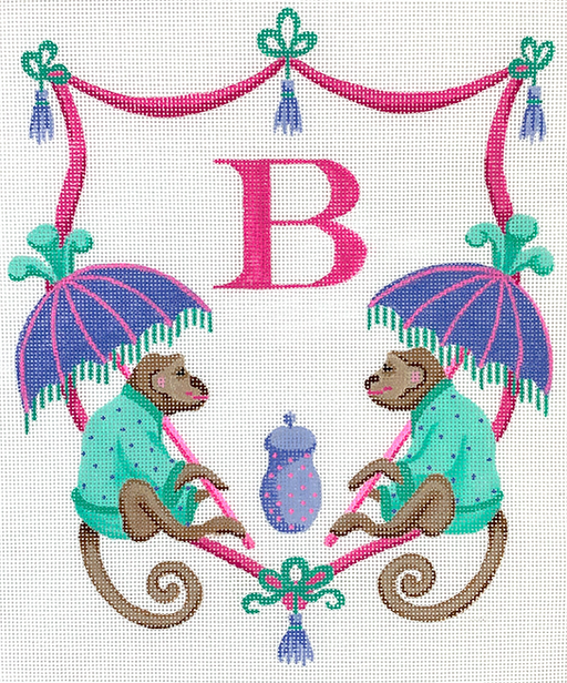 View full detailsMonogram Crest – Monkeys w/ Parasols – pinks, purples & turquoise
