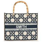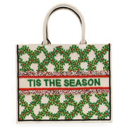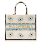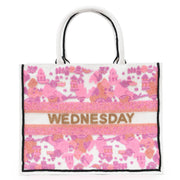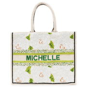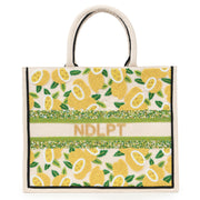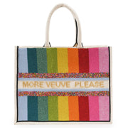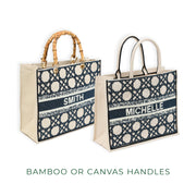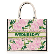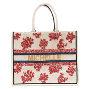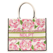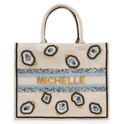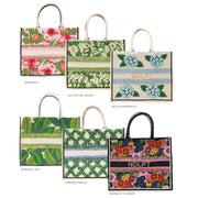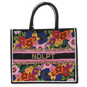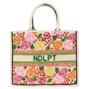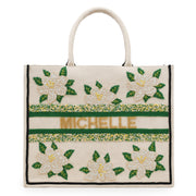 Open Top Canvas Tote with fully beaded front measures 16″ wide, 13″ tall , 6″ deep. Satin-lined with one small inside open pocket. Folds flat to pack - making it the perfect getaway bag.