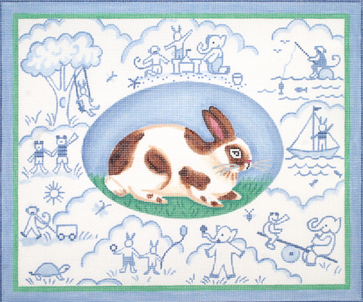 Kelly Rightsell – Blue Toile Bunny in Cart with Horse & Hen, Blue Gingham Border