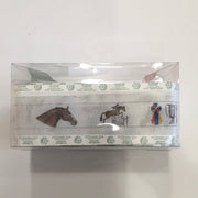 The design displays horses of various colors, a winning cup, and a show jumper.