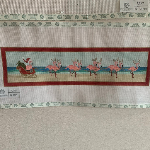Stitching Fox18m hand painted canvas featuring Flamingo Santa and Flamingo drawn sleigh on the beach. PP4404