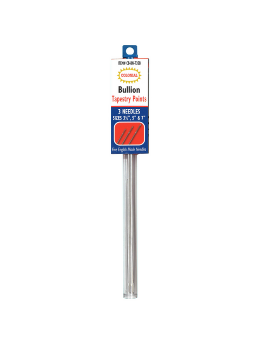 Colonial NeedleThe perfect blunt tools for Bullion, Cast-on, and Double Cast-on Knots. Long Size - 3 1/2", 5", 7" (1 Each) - 3 needles totalShort Size - 2 1/4", ...
