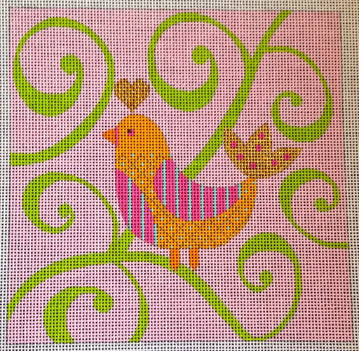 Mod Birds 4" Rnd - Pink/green Swirl Background