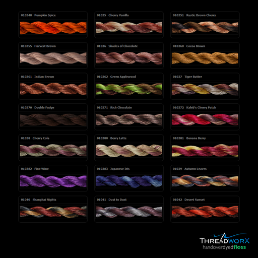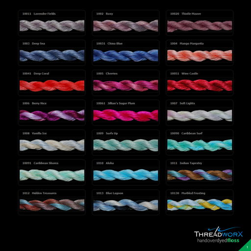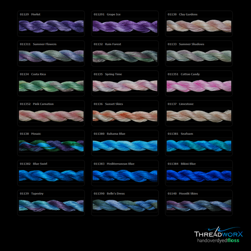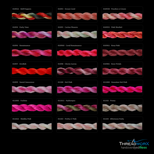 DMC six-strand embroidery floss • Artisan dyed by ThreadworX • 272 colors • 20 yard skein
