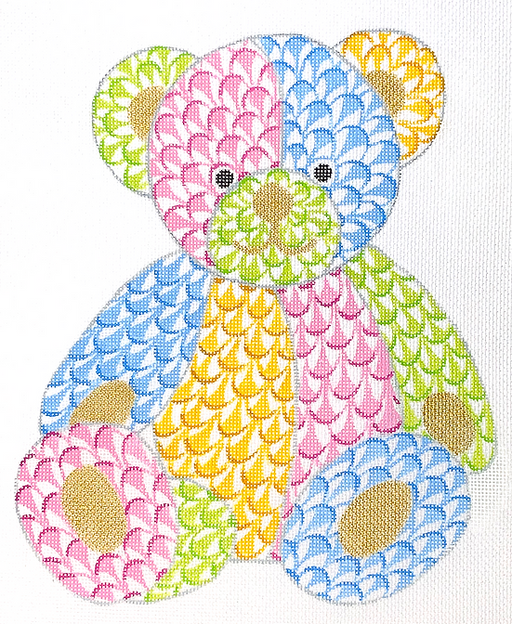 Herend-inspired Fishnet Patchwork Teddy Bear – pinks, blues, yellows & greens with gold