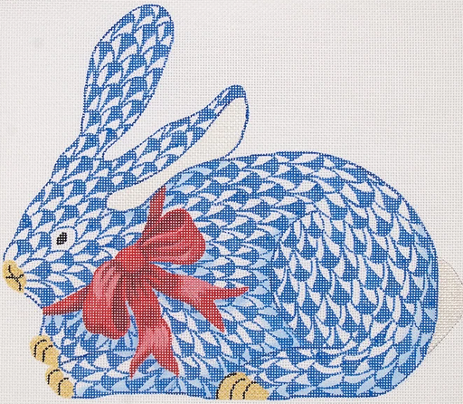 Herend-inspired Fishnet Bunny w/ Bow – Crouching Blue Bunny w/ Red Bow (All-American)
