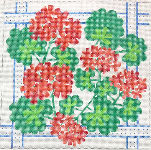 Geraniums Square w/ Ribbons – reds & greens w/ blues