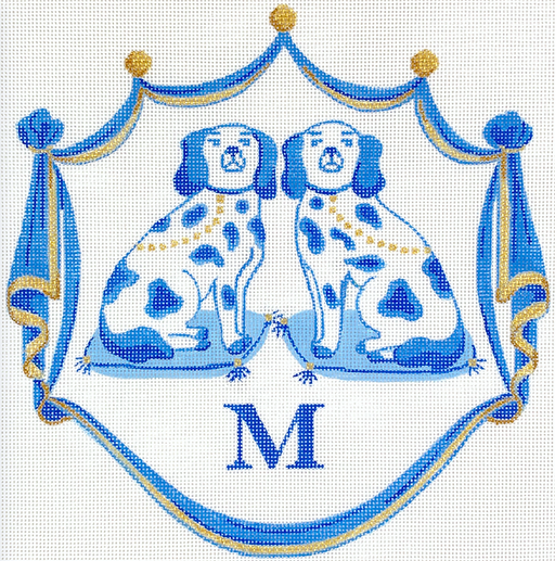 View full detailsMonogram Crest – Staffordshire Dogs on Cushions – blues, white & gold
