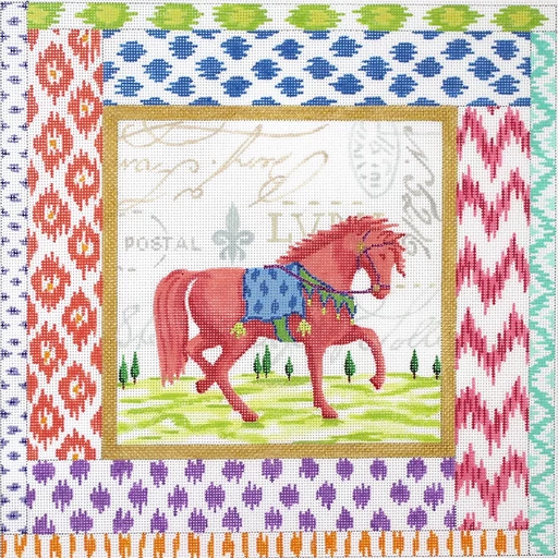 Exotic Collage – Coral Red Horse w/ Mixed Ikat Border