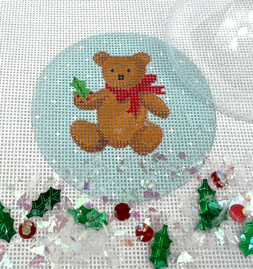 Christmas Ornament w/ Clear Dome Cover & Confetti – Teddy Bear w/ Red Bow on Snowy Sky