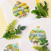 Kirk & Bradley Travel Round Ornaments are a customer favorite! This special collection features much loved gardens and parks, and are the perfect showcase for decorative threads and stitches!