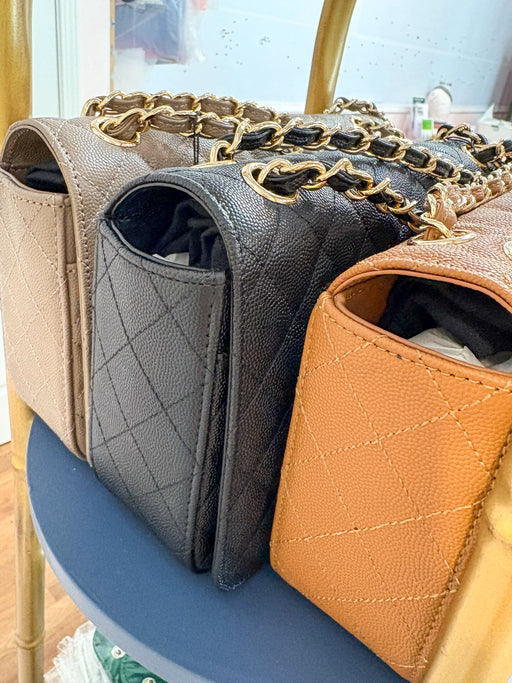 View full detailsBeautiful leather quilted classic flap purse with leather and chain strap. Strap can be adjusted for shoulder or cross body carry. 6.5" x 3.5" disp...