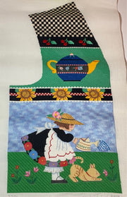 This Mary Engelbreit vest canvas is partially stitched and measures at 11.75” x 23.5“ on 18 mesh.