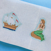 The Little Mermaid and Ship includes two ornament size canvases on one piece of 18 count canvas. Each canvas includes a free stitch guide by Jinny McAuliffe to complete the canvas as stitched. If you're not interested in decorative stitches, the canvases would be darling done all in Basketweave.