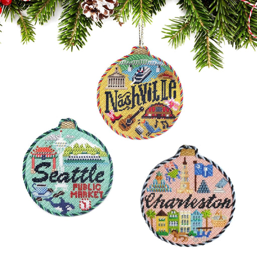 Bradley Needlepoint Company | Kirk & Bradley4" Round · 18m Kirk & Bradley Travel Round Ornaments are a customer favorite! Designs feature the personality and landmarks of various cities a...