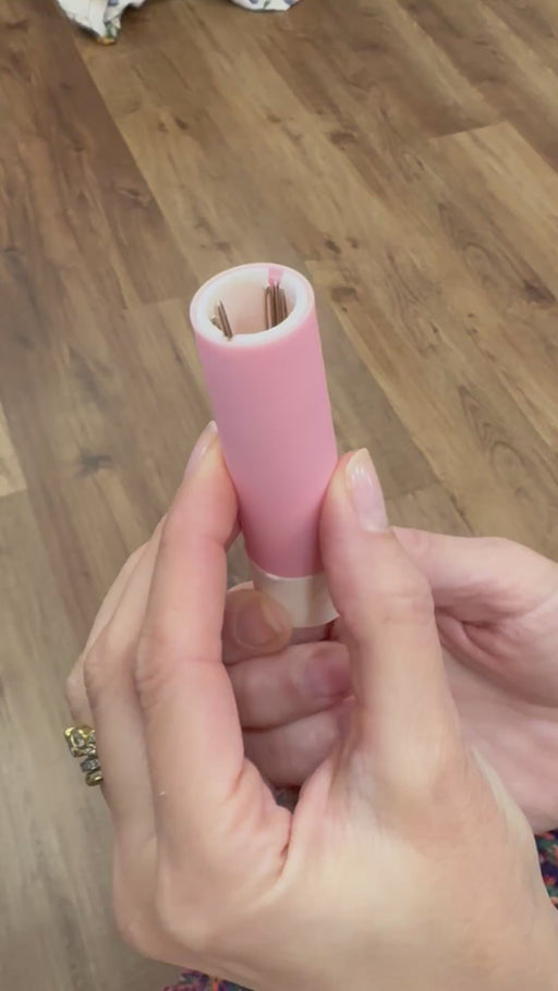 Victoria WhitsonRemove the cap and twist this cute pink bottle like lipstick to reveal your safely stored needles!