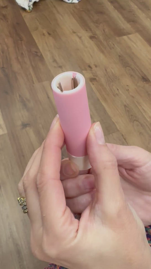 Remove the cap and twist this cute pink bottle like lipstick to reveal your safely stored needles!