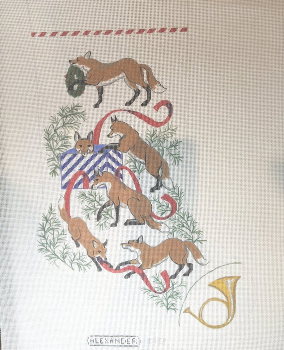 Christmas stocking by equine artist Bonnie Alexander featuring a playful fox motif. This generously sized Christmas stocking needlepoint canvas is the perfect finishing holiday touch.BA-03