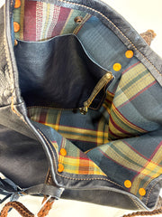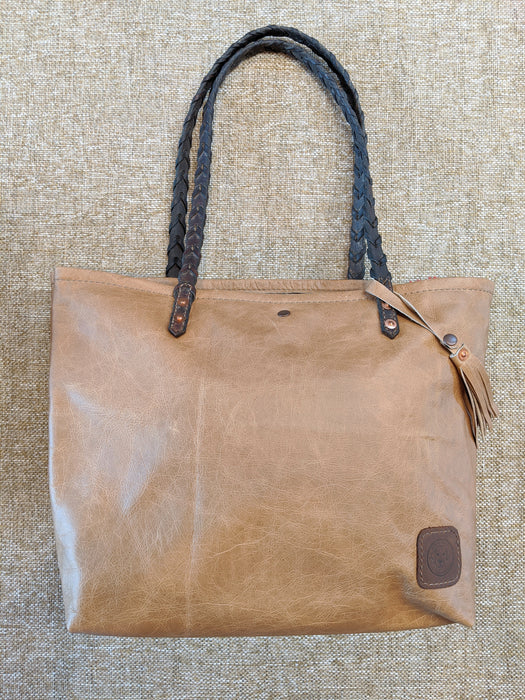Our signature Green River Handbag features a generous and functional size for everyday necessities. Constructed of top grain leather. 18x10x5. Straps made from vintage recycled bridle leather for a touch of equestrian style. Lining, side pocket, tassel and snap top included. The last left of our collection!
