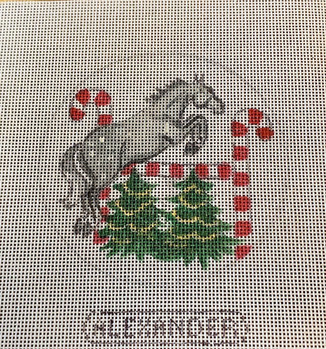 Hunter Jumpers will appreciate this original canvas ornament by Bonnie Alexander. This bold gray finds this candy cane jump as sweet as the candy itself.