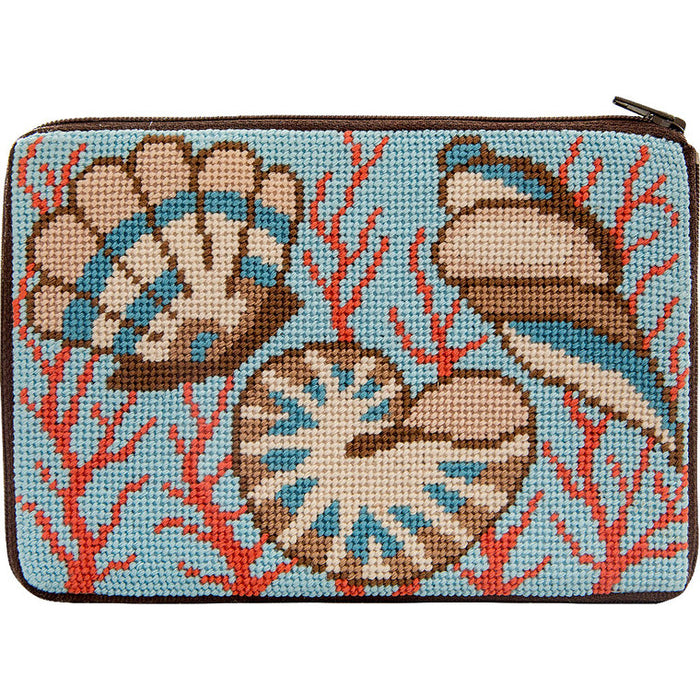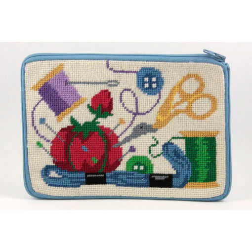 14 mesh cotton canvas attached to a nylon zipper with a fabric back. Cotton embroidery thread is included, along with a needle and instructions.