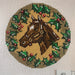6” round ornament canvas featuring a bay horse on gold background with holly border